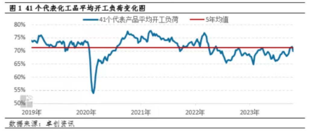 目前行业供大于求的需求也较为明显,根据咨询公司卓创资讯数据,2023年化工企业平均开工率不足70%,低于过去5年行业平均开工率水平。