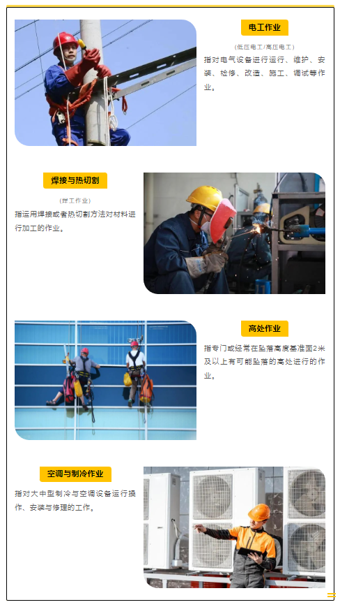 电工作业(低压电工作业,高压电工作业)、电力电缆作业、继电保护作业、电气试验作业、防爆电气作业、焊接与热切割作业、熔化焊接与热切割作业