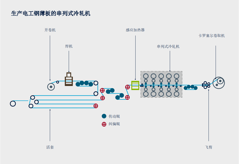 电工钢中的硅含量最高可达6.5%,其中典型商用钢种的硅含量最高为3.2%。硅含量增加意味着电阻增大。这类钢种通常轧制成薄和超薄规格,即0.25毫米及以下。厚度、强度和硅含量是其特性指标。不过,由于硬度和脆性增大的缘故,所有这些参数都对电工钢的可轧制性有影响。因此,对钢铁生产企业来说,这类钢种的轧制带来了更大的挑战。