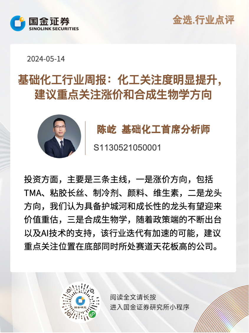 多因素催化下,本周基础化工板块指数明显走强,其中申万化工指数上涨4.02%,跑赢沪深300指数2.3%。标的方面,涨价标的表现亮眼,尤其是TMA及颜料相关标的,除此之外,民爆和合成生物学标的也有较佳表现,而一季度业绩大幅下滑的标的有所承压。估值层面,随着板块热度不断提升,估值有所回升,其中板块PB历史分位数为23%,PE历史分位数为64%。接下来重点更新下行业边际变化,化工行业,有两个事件值得关注,一是我们观察到海外龙头企业在退出,中国部分细分赛道龙头有望成为全球卷王,建议关注成本优势下降的欧洲化工品产业链,若海外主要竞争对手退出,产品价格有强势向上的可能,二是国内新材料不断在突破,比如:本周东华科技称其POE技术开发项目于2023年6月打通全流程。房地产行业,本周杭州、西安全面取消住房限购措施,政策端在持续发力。宏观数据方面,本周有两个数据超预期,一是中国4月进出口数据转正,超出市场预期,二是4月份挖掘机内销10780台,同比增长13%,超预期,政策端的持续呵护叠加数据端的超预期有望持续提升市场对于顺周期板块的关注度。机器人行业,近期特斯拉发布了Optimus最新进展视频,展现了其分拣电池、行走、执行工厂任务的能力,建议持续关注行业的边际变化。投资方面,主要是三条主线,一是涨价方向,包括TMA、粘胶长丝、制冷剂、颜料、维生素,二是龙头方向,我们认为具备护城河和成长性的龙头有望迎来价值重估,三是合成生物学,随着政策端的不断出台以及AI技术的支持,该行业迭代有加速的可能,建议重点关注位置在底部同时所处赛道天花板高的公司。