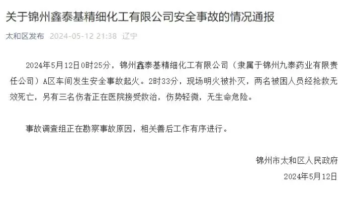 5月12日,锦州鑫泰基精细化工有限公司(隶属于锦州九泰药业有限责任公司)A区车间发生安全事故起火。2时33分,现场明火被扑灭,两名被困人员经抢救无效死亡,另有三名伤者正在医院接受救治,伤势轻微,无生命危险。事故调查组正在勘察事故原因,相关善后工作有序进行。