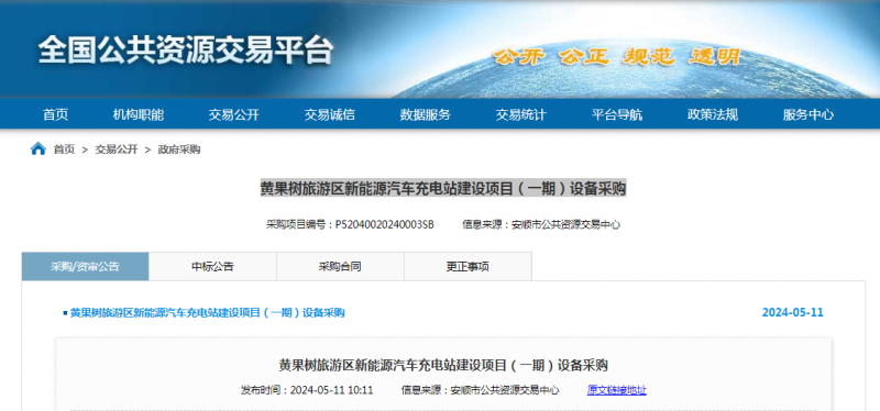 招标 | 贵州黄果树旅游区新能源汽车充电站建设项目(一期)设备采购公告
