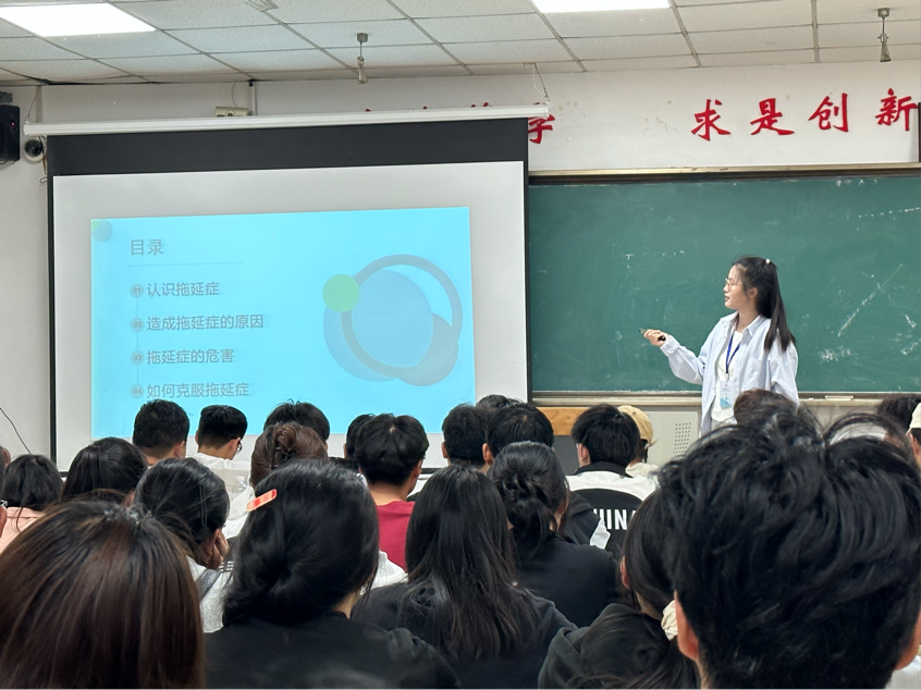 活动伊始,刘秀芹以图片、视频、问答的形式展开对拖延症的讲述,首先她讲述了拖延症的表现,并引发同学们对拖延症的思考。随后,刘秀芹引导同学们思考自己是否具有拖延症以及拖延症为日常生活带来的影响。刘秀芹邀请同学们分享自己对拖延症的认识。她强调拖延症的表现为缺乏自我管理、害怕失败、侥幸心理以及懒惰。紧接着,刘秀芹点明拖延症会为同学们带来压力、怀疑自我、萎靡不振等危害。最后,刘秀芹通过实战和理论两方面分享了克服拖延症的方法。