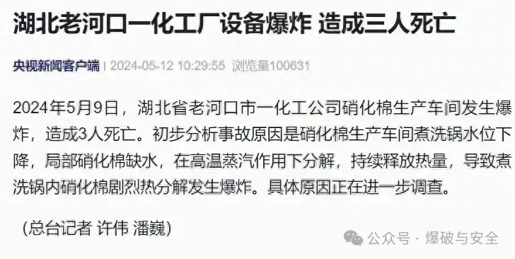 2024年5月9日,湖北省老河口市一化工公司硝化棉生产车间发生爆炸,造成3人死亡。初步分析事故原因是硝化棉生产车间煮洗锅水位下降,局部硝化棉缺水,在高温蒸汽作用下分解,持续释放热量,导致煮洗锅内硝化棉剧烈热分解发生爆炸。具体原因正在进一步调查。