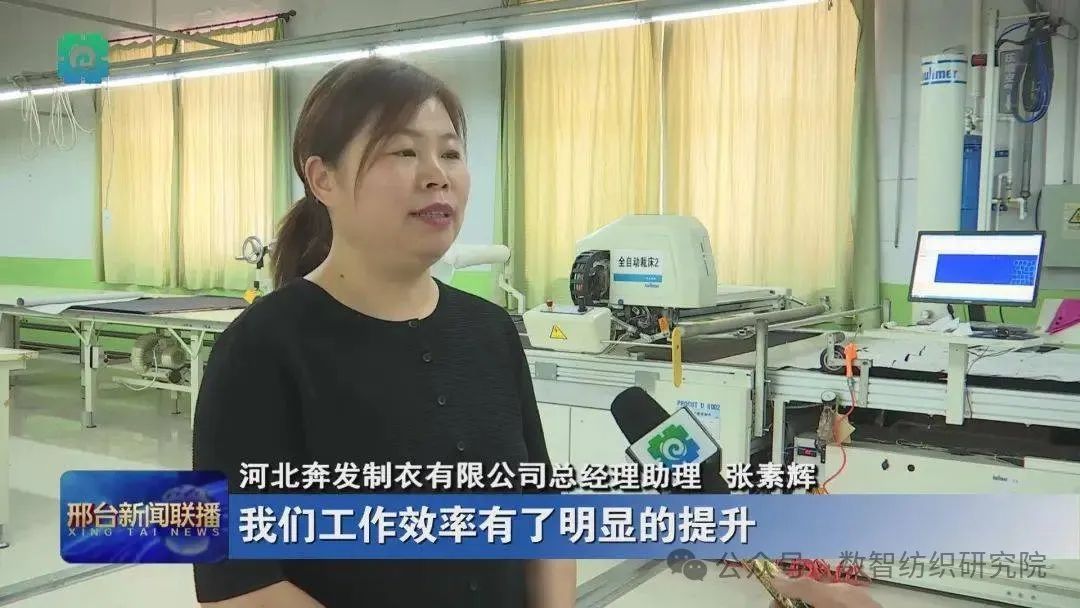 河北奔发制衣有限公司总经理助理张素辉介绍:“使用自动裁床以后,我们工作效率有了明显的提升,普通100多个部件的这个裁活,通过那个设备是20分钟完成,效率提升了50%以上,节省耗料3%-5%,还有自动裁床最大的优势,改善了裁剪的精准度,提高了后期制作的准确性。”