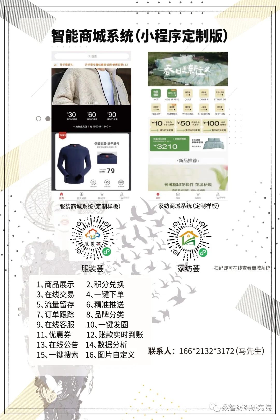 数智纺织研究院立志帮助品牌企业建立自己的专属营销渠道,锁定私域流量,直接在线裂变营销,打造品牌企业专属商城系统。