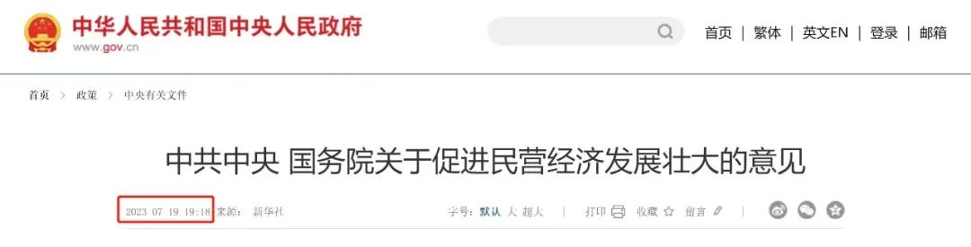 2023年7月,中共中央 国务院发布《关于促进民营经济发展壮大的意见》,并且发布《中共中央 国务院关于促进民营经济发展壮大的意见》权威答问。提出: