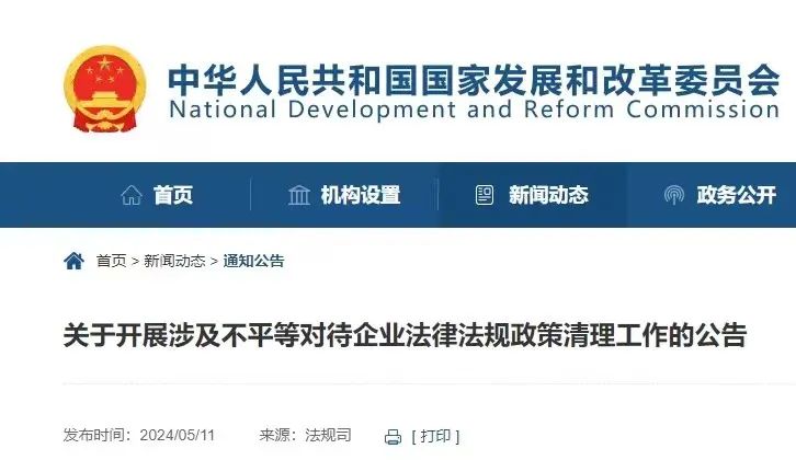 5月11日,国家发改委发布《关于开展涉及不平等对待企业法律法规政策清理工作的公告》。