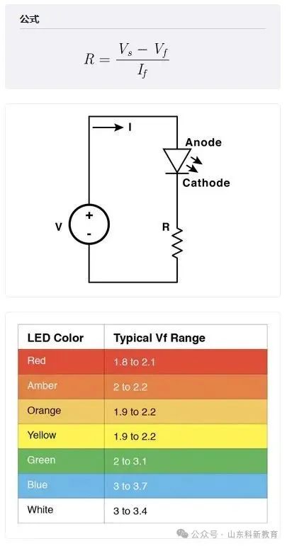 计算在指定电流水平下通过电压源驱动一个或多个串联LED所需的电阻。注意:当为此目的选择电阻器时,为避免电阻器温度过高,请选择额定功率是下方计算出的功率值的2至10倍之间的电阻器。