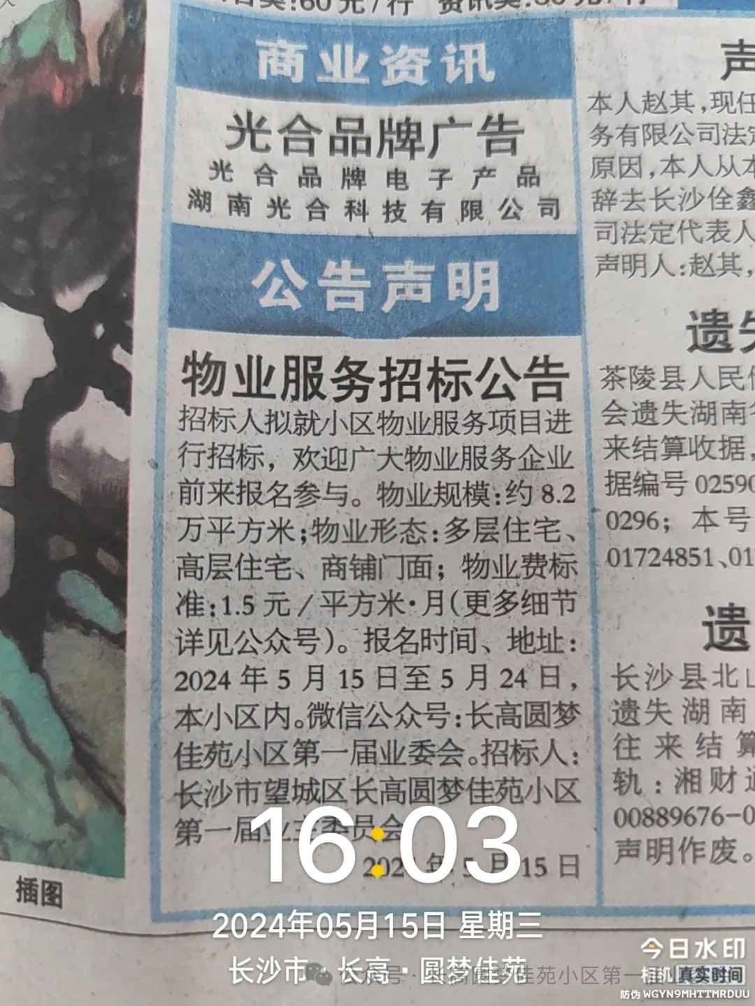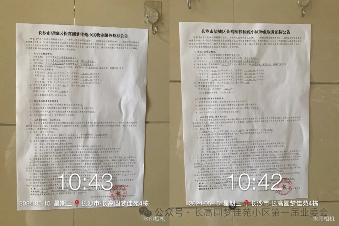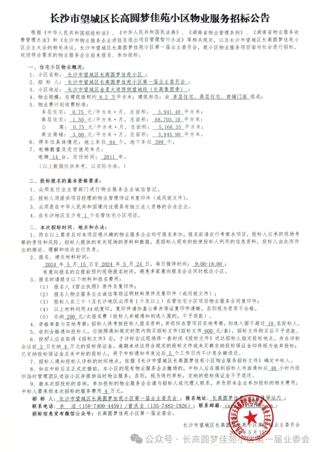 根据《中华人民共和国招投标法》、《中华人民共和国民法典》、《湖南省物业管理条例》、《湖南省物业服务收费管理办法》和《长沙市物业服务企业进驻及退出项目管理暂行办法》等相关规定,以及长沙市望城区长高圆梦佳苑小区业主大会的相关决议,长沙市望城区长高圆梦佳苑小区第一届业主委员会,就小区物业服务项目面向社会进行招标,欢迎符合要求的物业服务企业前来报名、参加投标。2、招 标 人: 长沙市望城区长高圆梦佳苑小区第一届业主委员会 ;3、小区地址: 长沙市望城区金星大道西侧望城段(长高集团旁) ;4、物业规模:总建筑面积约 8.2 万平方米;建筑形态:由 多层住宅、高层住宅、商铺门面 组成;多层住宅: 0.75 元/平方米·月,总面积: 3,941.40 平方米;高层住宅: 1.50 元/平方米·月,总面积: 68,705.10 平方米;公 寓: 0.75 元/平方米·月,总面积: 5,166.35 平方米;商业商铺: 3.00 元/平方米·月,总面积: 3,945.90 平方米。6、停车位具体情况:地上车位 84 个,地下车位 399 个。2、投标人须提供项目经理的物业管理师证书复印件(或同效文件)。3、必须是在中华人民共和国境内注册具有独立法人资格的合法企业。1、符合以上要求且对本项目感兴趣的物业服务企业均可报名参加,报名前请自行考察本项目,投标人应承担现场考察的责任和风险。招标人提供的有关现场的资料和数据,是招标人现有的能使投标人利用的信息资料,投标人由此而作出的推论、理解和结论自行负责。 2024 年 5 月 15 日至 2024 年 5 月 24 日,每日接待时间: 9:00-18:00 ;有意向报名的应提前预约现场报名时间,避免多家意向报名企业同时抵达小区。(2) 报名人物业服务企业诚信等级证明材料原件及复印件(或同效文件);(3) 投标人在 3 个(且长沙地区必须有1个及以上)在管住宅小区项目物业服务合同复印件;(4) 以上材料均用A4纸复印,复印件请加盖公章并保证复印件清晰,否则视为资质不合格。(5) 交纳 200 元/次报名费(投标人并被通知初选入围的,不予退款)。4、资格审查与实地考察:招标人将考核投标人报名资料,并组织在管项目实地考察,初选入围不超过 10 名投标人。5、收到合格通知投标人,应按照通知规定时限内购买招标文件(招标文件 600 元/套),招标文件购买后不予退款。6、投标人应在取得《招标文件》后,于评标会议现场将一套封闭《投标文件》送达招标人指定投标地点,并在评标会议前 3 日交纳 4 万元的投标保证金。逾期未送达符合规定的投标文件或未足额交纳投标保证金均将视为放弃投标;已交纳投标保证金且未中标的投标人,将于中标通知书发出后 5 个工作日内不计息全额退还。8、如在中标后且正式交接前,本小区的现有物业服务企业撤场的,中标人应在接到招标人书面通知后 48 小时内组织临时管理团队进驻小区并提供临时物业服务;否则,视为违约弃标,交纳的投标保证金不予退还。9、就本次招投标的咨询,参加投标的物业服务企业请与招标人或代理人联系,并负担本企业参加投标的相关费用;中标人需承担本次招标的服务费用 4 万元。招 标 人: 长沙市望城区长高圆梦佳苑小区第一届业主委员会 ;联系电话: 余洁(158-7400-4459)或曾庆全(135-7483-1926);联系邮箱: cgymjyywh@163.com ;招标信息发布微信公众号:长高圆梦佳苑小区第一届业委会。