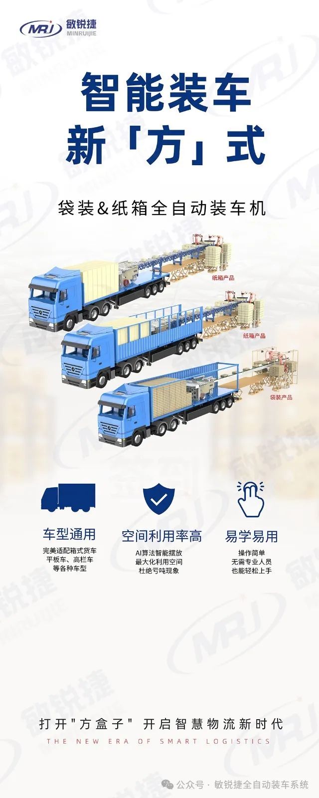 智能装卸解决方案引领者——敏锐捷,是国家高新技术企业、科技型中小企业,主营产品包括袋装全自动装车机、纸箱全自动装车机及布匹全自动装车机。更多装车方案请联系18038057079。
