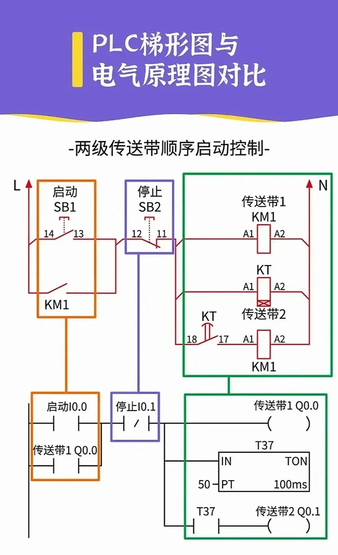 24.PLC梯形图与电气原理图对比(两级传送带顺序启动控制)