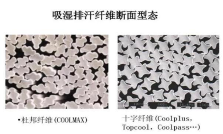化学吸湿排汗纤维主要是利用纤维截面异形化(Y 字形、十字形、W 形和骨头形等)使纤维表面形成凹槽,借助凹槽的芯吸导湿结构,迅速吸收皮肤表层湿气及汗水,并瞬间排出体外,再由布表的纤维将汗水扩散并迅速蒸发掉,从而达到吸湿排汗、调节体温的目的,使肌肤保持干爽与凉快。
