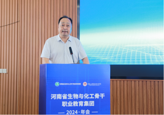 薄新党代表学校致欢迎辞。他向出席会议的各位领导、嘉宾表示热烈的欢迎和衷心的感谢,并介绍了学校的办学历程和办学成果。他表示,作为职教集团牵头单位,自集团成立以来,学校锚定职业教育类型定位,充分发挥集团成员单位的作用,积极拓展校企合作深度广度,构建政、行、企、校合作新格局,为省内外生物与化工行业发展注入新能量。希望与会人员紧紧围绕省委、省政府的重大战略部署,瞄准区域和行业发展需要,共探校企合作新模式、共商产教融合新路径、共促校企联动新成效、共建校企平台新发展。