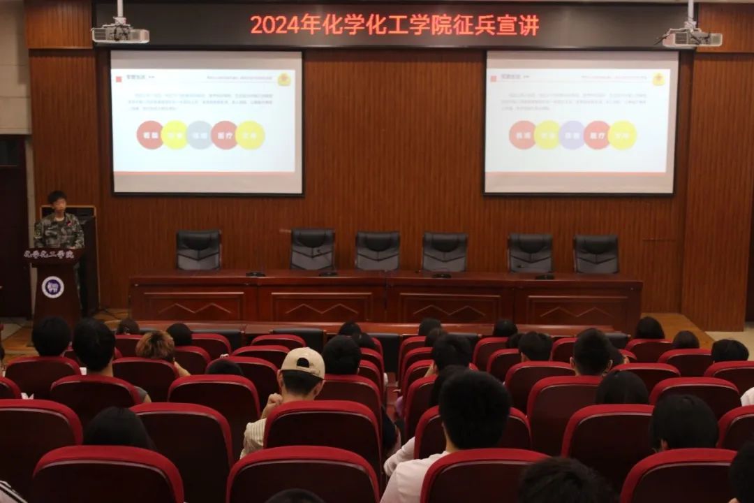 青春,是热血的代名词;报国,是青春的至高荣誉!2024年5月13日,化学化工学院在工科5-112举办了征兵宣讲活动。这次活动旨在向广大学生普及国防知识,激发爱国情怀,引导学生积极参与国防建设,服务国家和人民。