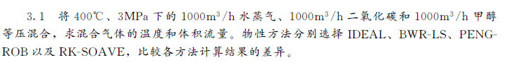 习题3.1-将400℃、3MPa下的1000m3/h水蒸气、1000m3/h二氧化碳和1000m3/h甲醇等压混合,求混合气体的温度和体积流量。物性方法分别选择IDEAL、BWR-LS、PENGROB以及RK-SOAVE,比较各方法计算结果的差异。