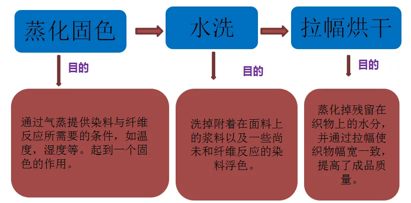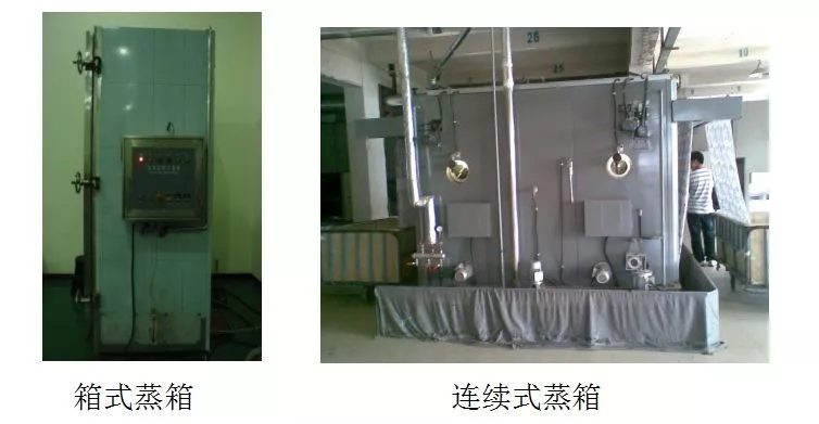 主要是用的两款蒸箱,一款是传统印花蒸箱缩小改进而来的连续式蒸箱,另外一款是定制的箱式蒸箱。对比两款蒸箱使用效果各有利弊,实验室打小样一般选用箱式蒸箱(优点:饱和蒸汽充足,发色鲜艳,价格低廉,占地空间小。缺点:上下蒸汽不均匀,可能会造成图案鲜艳度有细微差别)。而工厂生产一般选用连续式蒸箱(优点:饱和蒸汽均匀,生产稳定性高,效率高。缺点:蒸出来的颜色相对更浅,占地空间大,耗能大)。气蒸温度一般为102℃-105℃。气蒸时间视面料的的种类不同而异,对于棉织物气蒸时间一般为10min-15min,汽蒸时间过短,使染料发色不足,造成得色较浅;汽蒸时间过长,会造成染料水解,得色量下降。