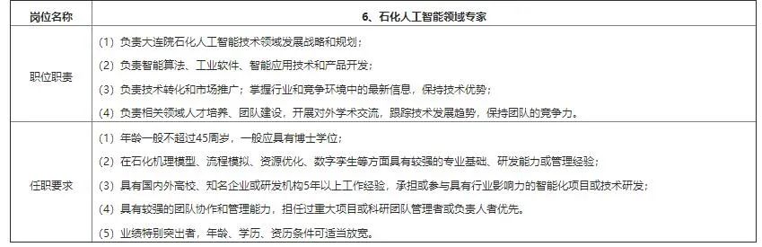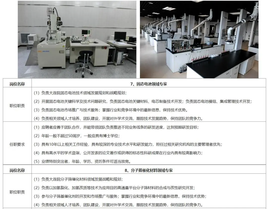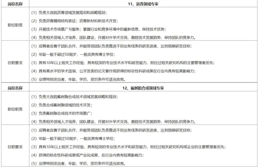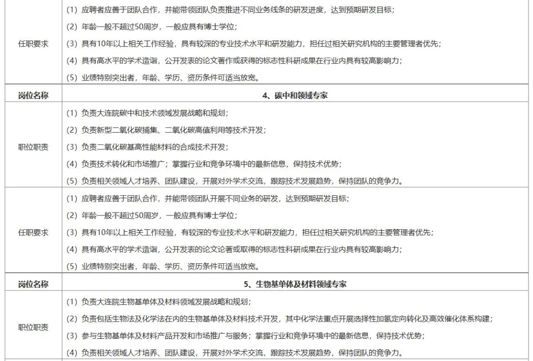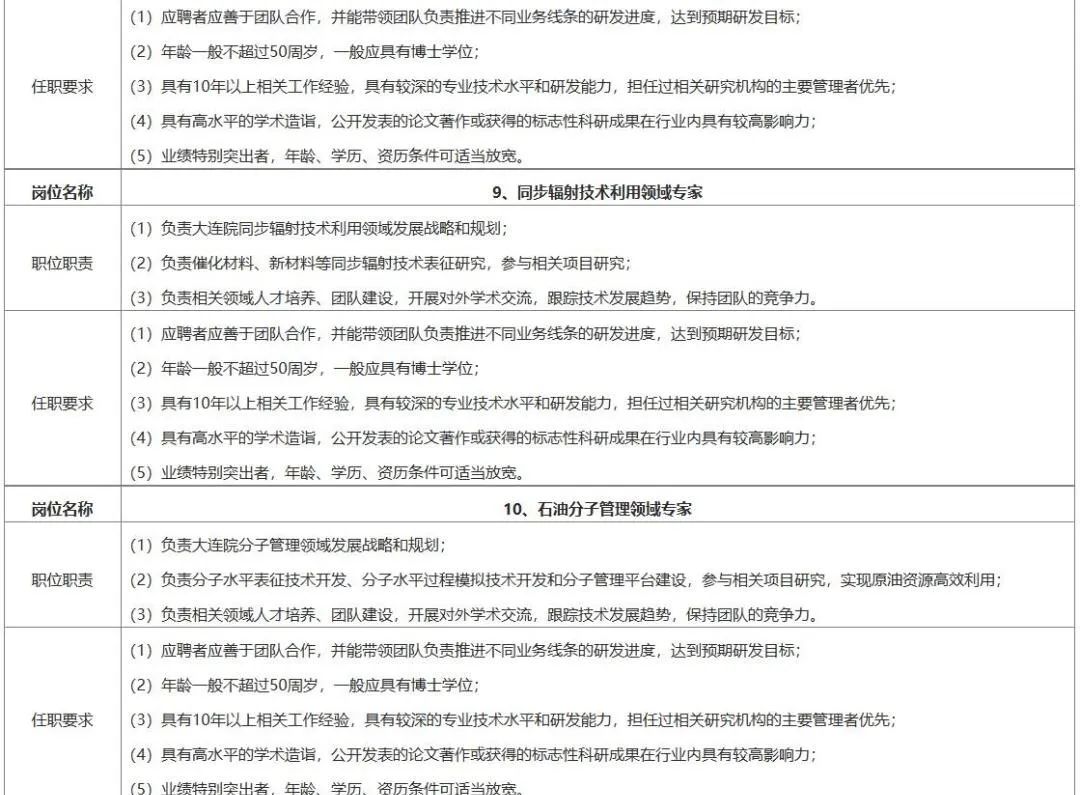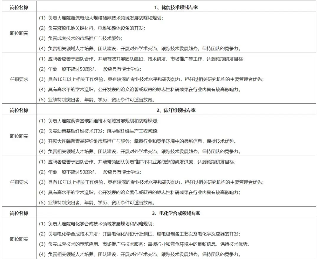 大连院全球高层次人才引进计划主要针对储能、碳纤维、、电化学合成、碳中和、生物基单体及材料、石化人工智能、固态电池、分子筛催化材料、同步辐射技术利用、石油分子管理、沥青、氟树脂合成等十二个岗位进行全球范围招聘。