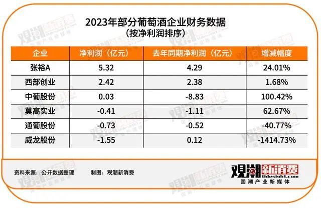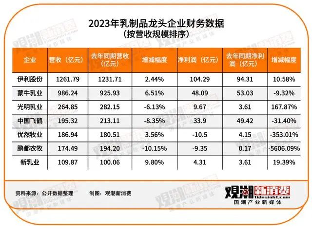 除白酒这一大单品外,在观潮新消费梳理的葡萄酒、啤酒等15家其他酒类上市企业中,共有8家企业实现正向增长,1家呈下跌趋势,4家连续亏损,1家扭亏为盈,1家转盈为亏。具体而言,6家葡萄酒企业中,张裕实现营收43.85亿元,同比增长11.89%;净利润5.32亿元,同比增长24.01%。除此之外,中葡股份和西部创业实现盈利,而莫高实业、通葡股份和威龙股份则呈亏损状态。从啤酒上市公司来看,近七成企业都实现了正向盈利,其中百威亚太、华润啤酒、青岛啤酒、重庆啤酒、燕京啤酒保持百亿规模,分别实现营收494.67亿元、389.32亿元、339.37亿元、148.15亿元和142.13亿元,净利润61.47亿元、51.53亿元、42.68亿元、13.37亿元和6.45亿元,稳步增长。在啤酒企业中,兰州黄河净利润跌幅最大。2023年,兰州黄河实现营业收入约2.41亿元,同比下滑9.47%;归属于上市公司股东的净利润为-4672.07万元,同比下滑59.76%。兰州黄河在公告中表示,2023年,公司麦芽产品成本高企,市场竞争力不强,议价能力较弱,再加上公司啤酒主业自用量减少,无法有效拉动麦芽销售,造成报告期内公司麦芽产销量和销售收入同比均有所下降。乳制品:寻找新增长点