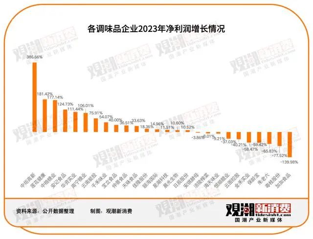 2023年,调味品上市公司喜忧参半,基础调味料企业业绩多数呈下滑态势,复合调味品企业表现较佳。在观潮新消费梳理的26家调味品企业中,共有12家实现净利润正增长,3家扭亏为盈,9家呈下跌趋势,2家转盈为亏。值得注意的是,主打酱油的海天、加加食品,主营业务是醋的恒顺醋业等业绩下滑严重。其中,2023年重仓“零添加”的加加食品,业绩仍没迎来好转,亏损持续扩大,2023年实现净亏损1.91亿元,也是该品类中跌幅最大的企业。