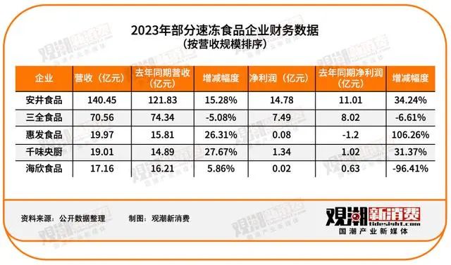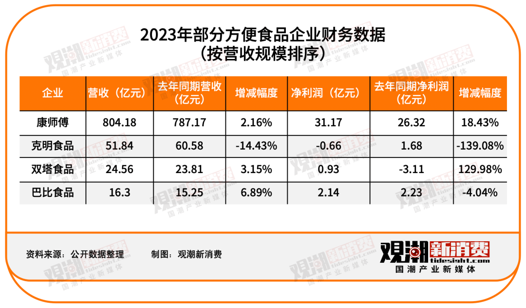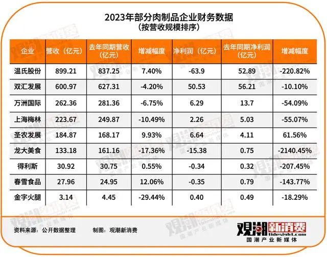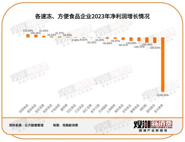 在观潮新消费梳理的18家速冻、方便食品上市企业中,共有4家企业净利润实现正向增长,7家有所下滑,2家扭亏为盈,5家转盈为亏。从速冻食品来看,龙头企业安井食品2023年实现营收140.45亿元,净利润14.78亿元,同比增长34.24%。惠发食品和千味央厨业绩有所上升,净利润分别增长106.26%和31.37%。海欣食品2023年实现营收17.16亿元,同比增长5.86%,但净利润仅为227.01万元,较上年同期下降了96.41%。对于业绩下滑原因,海欣食品发公告表示,公司优化产品结构,加强电商渠道的建设,渠道开拓过程中增加了相关推广费用,以及维护和管理商超渠道加大了促销政策,给公司短期利润带来一定影响。此外,公司舟山腾新(浙江海欣)工厂尚处于产能爬坡期,产能利用率不足,折旧摊销等固定支出较多。从肉制品的9家企业来看,除圣农发展业绩有所上升以外,其余企业业绩均有所下滑。其中龙大美食下滑尤为明显,净利润从去年同期的0.75亿元转盈为亏,下跌至-15.38亿元。对于2023年业绩亏损原因,龙大美食在财报中表示,主要系毛猪销售价格及猪肉市场价格持续下跌,并叠加疫病影响导致。生猪价格低迷也是众多肉制品企业面临的主要难题之一。双汇发展同样在年报中提到:“肉类行业生猪供应充足,猪价相对较低,市场猪多肉多,竞争激烈;肉制品行业总体消费不振。”从4家上市的方便食品企业来看,康师傅2023年实现营收804.18亿元,净利润31.17亿元,业绩稳步增长;双塔食品扭亏为盈,2023年实现净利润0.93亿元;巴比食品业绩有所下滑;克明食品则转盈为亏,2023年实现净亏损0.66亿元。