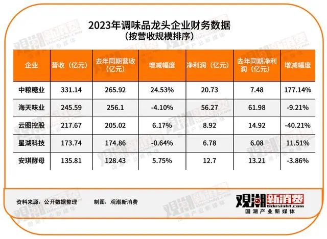 2023年对于乳制品上市企业来说是压力不减的一年。在观潮新消费梳理的26家乳制品上市公司中,共有10家企业实现净利润正增长,2家扭亏为盈,9家呈下跌趋势,4家转盈为亏,1家连续亏损。2023年,伊利、蒙牛、光明、飞鹤、优然牧业、鹏都农牧、新乳业分别实现营收1261.79亿元、986.24亿元、264.85亿元、195.32亿元、186.94亿元、174.49亿元和109.87亿元,稳坐百亿阵营。但蒙牛、飞鹤、优然牧业、鹏都农牧的净利润较去年同期有所下跌,其中优然牧业和鹏都农牧2023年转盈为亏,净亏损分别为10.5亿元和9.35亿元。相对而言,部分区域乳企业绩表现要好于市场预期。三元、皇氏、一鸣、燕塘等区域乳企保持着高双位数及以上的增幅。这主要与国内原奶过剩、价格大幅下跌有关,低奶价带来了低成本,让奶源主要依靠外购的区域乳企从中受益。净利润同比下跌的企业共9家,除上述提到的蒙牛和飞鹤,还包括澳优、妙可蓝多、中国圣牧、天润乳品、均瑶健康、科拓生物和海融科技。除此之外,有四家企业净利润转盈为亏,除了优然牧业和鹏都农牧,还包括西部牧业和庄园牧场。麦趣尔净利润则连续亏损,2023年虽有所好转,但仍未打破亏损态势,实现净利润-9709.85万元。可以看到,对于原奶企业,饲料成本增加、原奶价格低位运行;对于奶粉企业,行业竞争加剧,存量竞争日趋严峻,各细分赛道企业均需在加强控盘稳价力度的同时寻找新的增长曲线。调味品:零添加,跌幅大