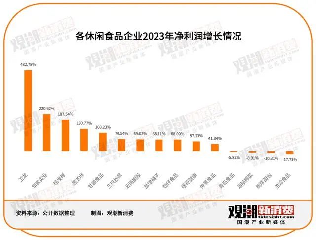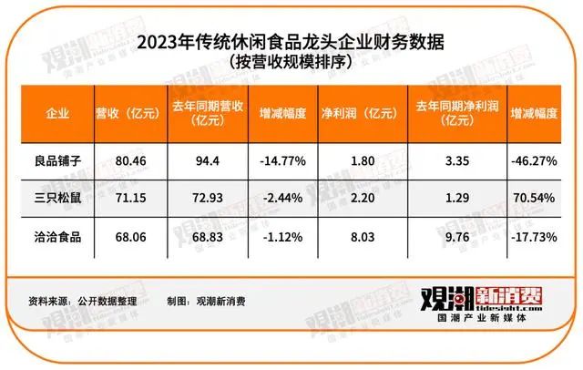 当下,休闲零食渠道变革正在持续深化,量贩零食店在消费者和资本两个维度上都受到越来越多的青睐。在观潮新消费梳理的15家休闲食品企业中,共有5家企业净利润实现正向增长,2家扭亏为盈,7家有所下滑,1家连续亏损。2023年,休闲食品行业渠道发生了大变革。渠道红利的爆发被体量较小、新兴的公司享受最多,现阶段量贩零食渠道红利下代表性上市公司则包括盐津铺子、劲仔食品和甘源食品等。渠道变革的红利也在这些企业的年报中有所体现,这些企业均在2023年实现了营收和净利润的双增长。同时,作为半路杀出来的“外来者”,万辰集团这个原本从事菌菇培育和销售的公司在涉足量贩零食行业之后也迎来了营收上质的飞跃。2023年10月,万辰集团将旗下“陆小馋”“好想来”“来优品”和“吖嘀吖嘀” 四大品牌统一合并为“好想来品牌零食”之后,截止2023年末,万辰旗下零食量贩门店达到近5000家,公司总营收暴涨至92.94亿元,其中零食量贩业务贡献了87.59亿元。对比之下,传统休闲食品公司增长疲软,“老三巨头”——良品铺子、三只松鼠、洽洽均在营收上有不同程度的缩水。未来该从何处突破,如何寻找新的增长曲线,都是传统休闲食品企业需要解决的难题。卤制品:煌上煌“三连跌”