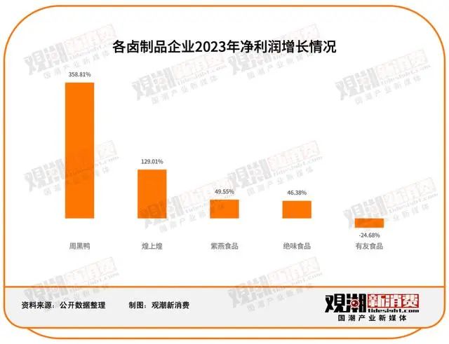 从观潮新消费梳理的5家卤制品企业的年报来看,2023年,卤制品企业中有4家净利润实现正向增长,仅1家有所下降。从营收来看,绝味食品2023年实现营业收入72.61亿元,同比增长9.64%,当属行业龙头。绝味的利润增长也较为明显。报告期内,绝味实现净利润3.44亿元,同比增长46.63%。截至报告期末,中国大陆地区门店总数15950家。相比之下,煌上煌营收则“连跌三年”。报告期内,煌上煌实现营业收入19.21亿元,同比微降1.70%;实现净利润7058.55万元,同比增长129.01%。年报称,报告期二季度以来,鸭副产品主要原材料价格出现下行,生产成本的逐步回落带来肉制品综合毛利率的稳步回升。有友食品是卤制品行业中唯一实现净利润负增长的企业。2023年,有友食品实现营业收入9.66亿元,同比下滑5.68%;归母净利润1.16亿元,同比下滑24.68%。面对竞争愈发激烈的泡卤赛道,研发能力不足、产品结构单一以及过度依赖线下模式都是有友急需解决的难题。