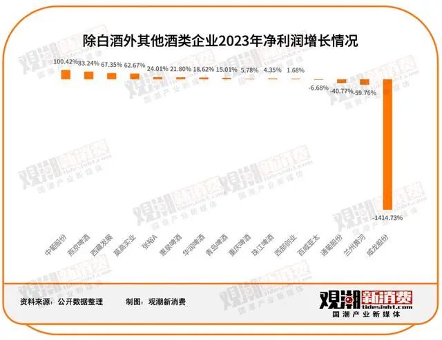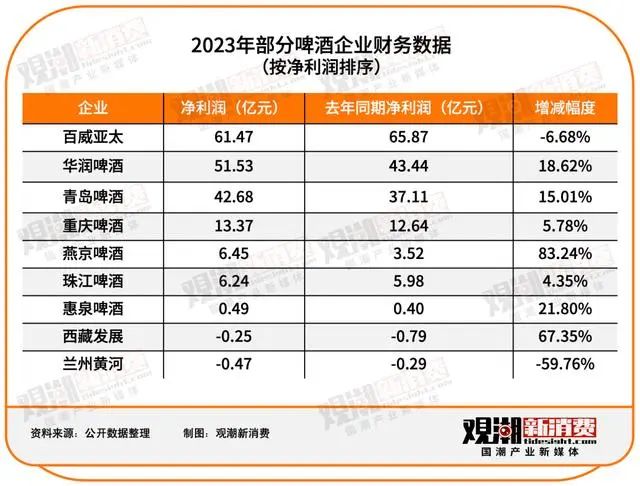 整体来看,2023年白酒行业始终保持着稳健发展态势,多数企业业绩向好。在观潮新消费复盘的20家白酒企业中,共有15家企业实现正向增长,2家呈下跌趋势,2家连续亏损,1家转盈为亏。“茅五泸汾洋”2023年分别实现净利润747.34亿元、302.11亿元、132.46亿元、104.38亿元以及100.16亿元,业绩遥遥领先。值得一提的是,岩石股份、伊力特净利润增长迅猛,较上年分别增长133%和106%,分别实现净利润8707.04万元和3.4亿元。相比之下,盈利表现不佳的企业共5家,分别是金种子、顺鑫农业、老白干酒、酒鬼酒和皇台酒业。其中金种子、顺鑫农业连续亏损,老白干酒、酒鬼酒业绩下滑,皇台酒业则是转盈为亏,2023年净亏损约1500万元。对于正处于存量竞争时代的白酒行业来讲,具有健康现金流和稳定经营模式的龙头企业将会继续带领行业发展。从消费群体来说,白酒消费更加多元,随着80后90后逐步成为酒类主力消费人群,无论在产品还是销售渠道等方面,都将出现革新性的机会。其他酒类:消费者爱啤酒