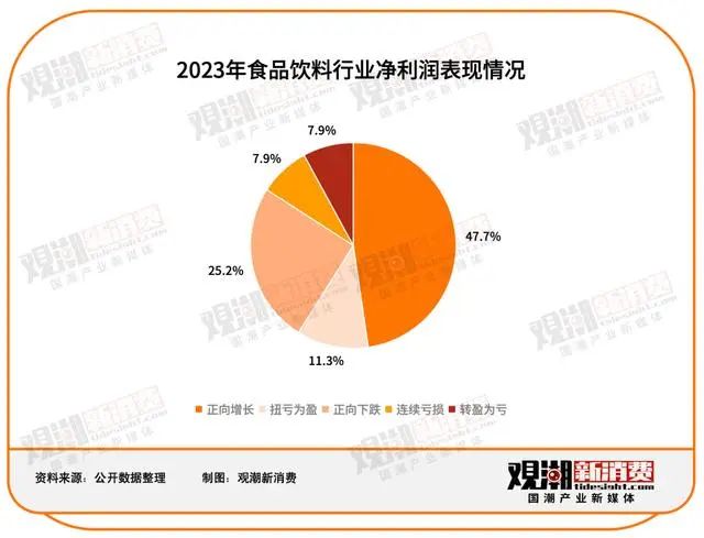 2023年,国内食品饮料上市公司业绩大多呈复苏态势。本文作者:观潮研究院,来源:观潮新消费(ID:TideSight)截至4月30日,国内食品饮料上市企业2023年年报已全部出炉。观潮新消费梳理了151家在国内外上市的中国食品饮料企业年报。总体来看,2023年食品饮料板块上市公司合计实现净利润2458.29亿元,同比增长11.99%。据各家披露的数据显示,2023年国内食品饮料上市公司业绩大多呈复苏态势,共有72家企业净利润实现正向增长,17家企业扭亏为盈,合计占比约58.94%。具体到细分赛道,餐饮、乳制品、休闲食品、酒类、饮料、卤味、休闲食品等9大品类中共有6个品类实现半数以上企业正向增长或扭亏为盈,表现向好。其中,白酒、餐饮和卤味更是有超过80%的企业实现快速增长。但同时也不得不承认,企业赚钱越来越难。在151家企业中,2023年的平均营收增速达到20.5%,但净利润平均增速却是-32.22%。对消费行业而言,2023年是充满变局的一年。上游产能过剩,下游消费趋向理性,极致性价比的风潮席卷了各个品类。有人崛起,有人掉队,有人仍在寻找机会。通过对151家食品饮料上市企业的年报解读,可一窥市场变化对食品饮料行业带来的影响。白酒稳健