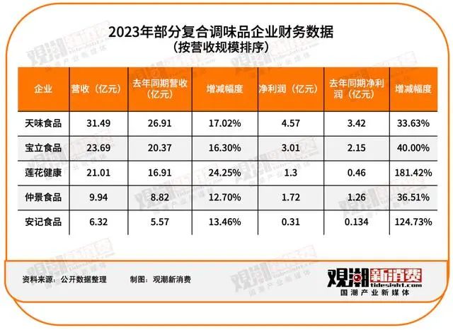 反之,复合调味料表现较佳。2023年,天味食品、宝立食品、莲花健康、安记食品、仲景食品等多家公司均迎来营收和净利润的双位数增长。