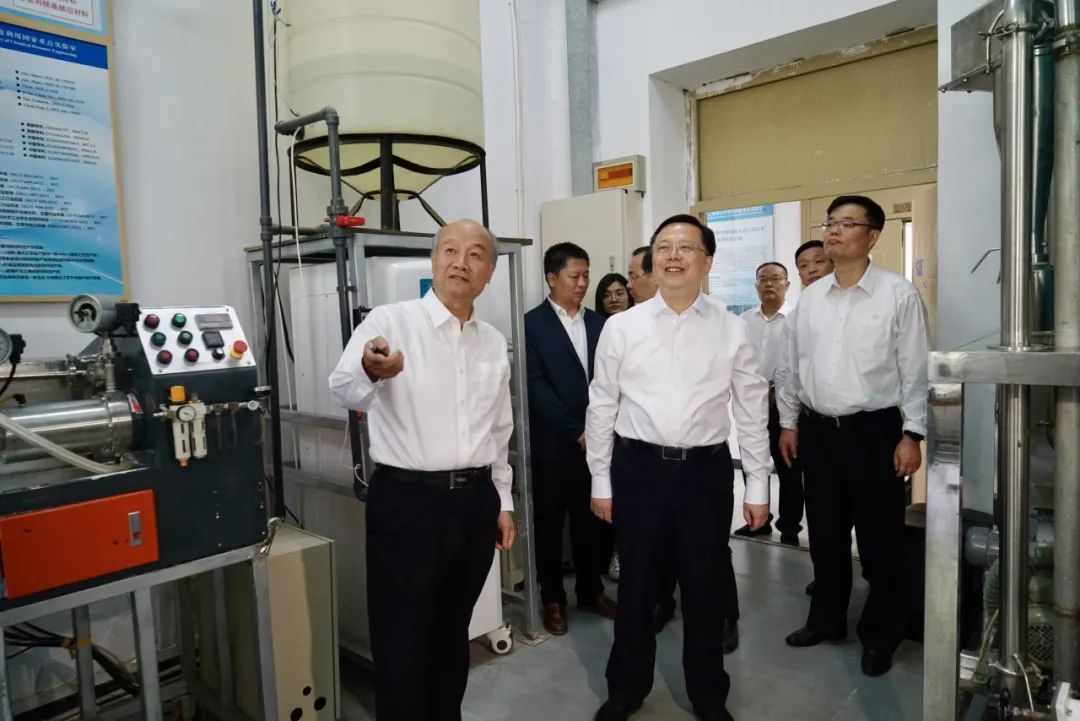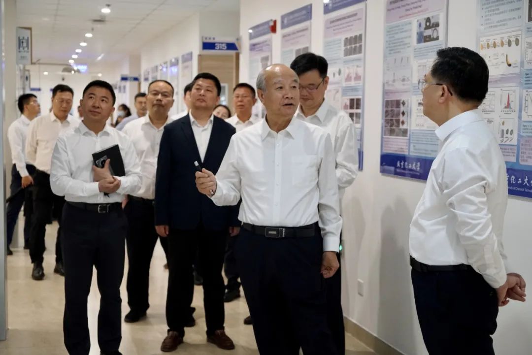 高屹书记一行现场调研了化工资源有效利用国家重点实验室的工作和实验环境,与实验室人员进行了交流与沟通,段雪院士亲自介绍了化工资源有效利用国家重点实验室的历史沿革、团队组成、学术方向、科研成果及转化等情况,重点介绍了实验室与衢州合作以来在成果转化和产业化方面取得的进展,特别是对衢州基地与中国化学工程第七建设有限公司建立“工程化创新联合研究中心”及与七化建技术合作在衢投资建设“15 万吨/年成核晶化隔离微化工技术生产高端无机精细化学品项目”的情况进行了详细介绍。