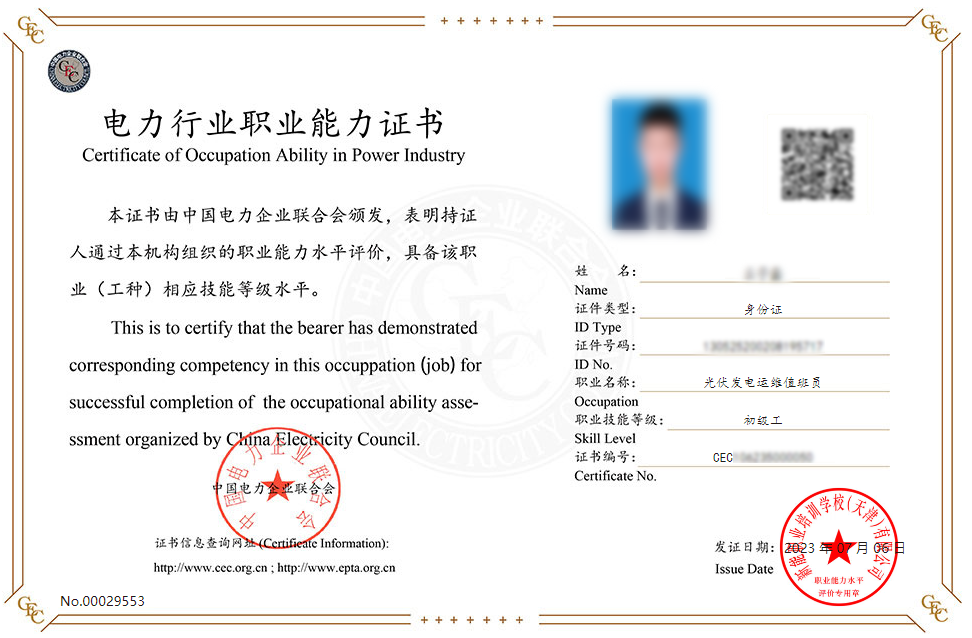 在经过评价基地(中广核实训基地)的专业测评考试合格后,可获取“电力行业职业能力证书——光伏发电运维值班员(初级工)”,证书由中国电力企业联合会颁发,表明持证人通过中电联组织的职业能力水平评价,具备该职业(工种)相应技能等级水平。