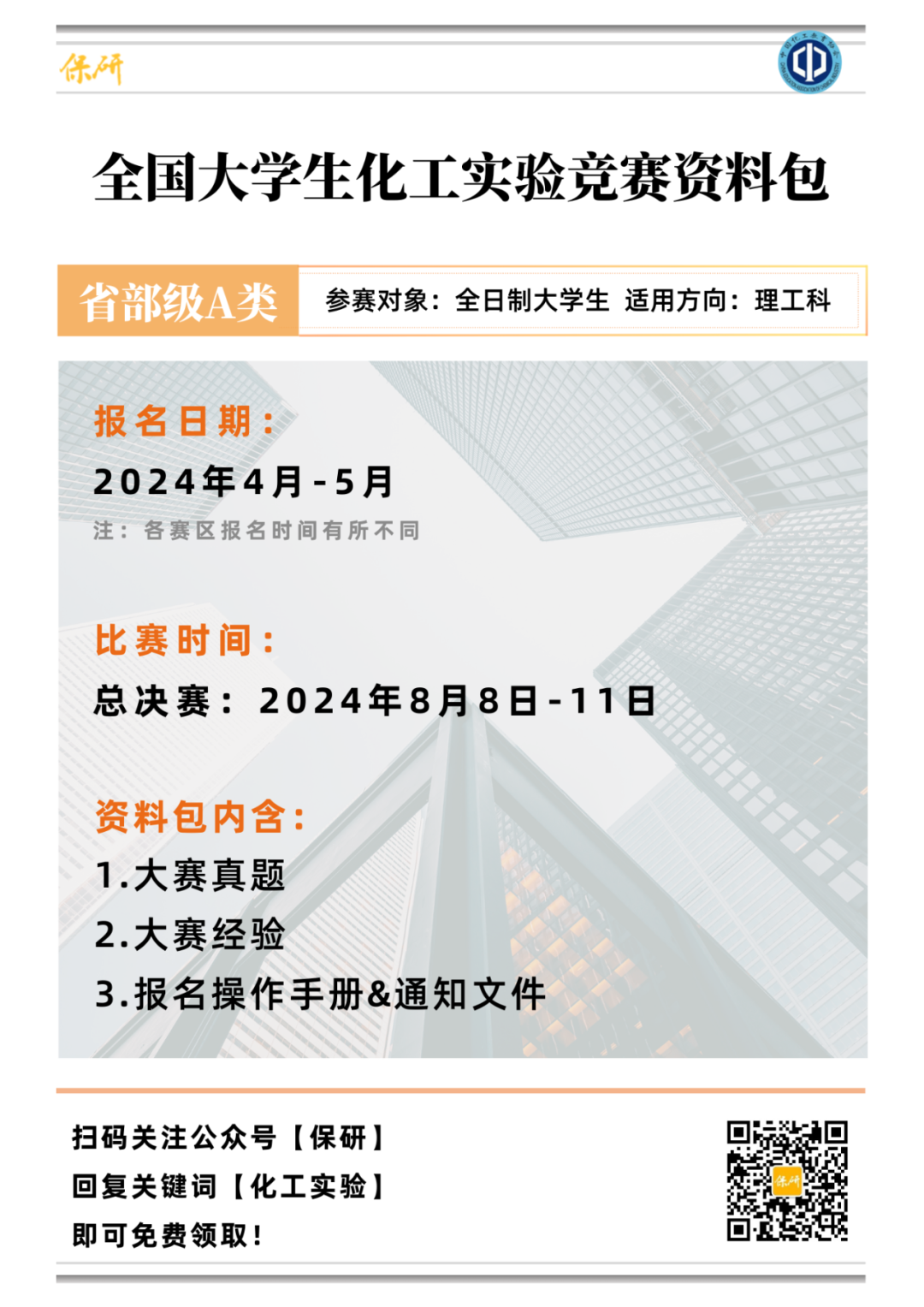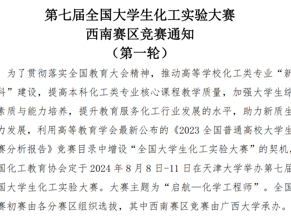 为了贯彻落实全国教育大会精神,推动高等学校化工类专业“新工科”建设,提高本科化工类专业核心课程教学质量,加强大学生综合素质与能力培养,提升教育服务石油和化工行业发展的水平,定于2024年举办第七届全国大学生化工实验大赛。大赛主题为“启航—化学工程师”。