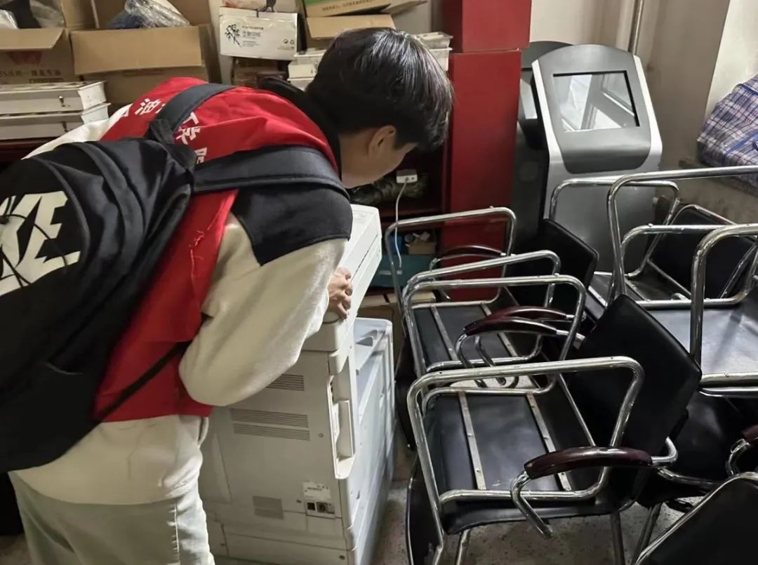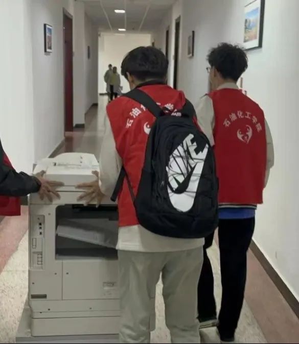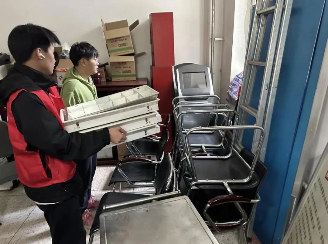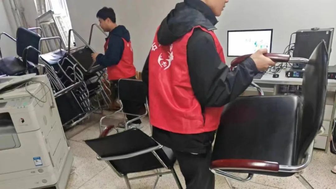 搬运过程中志愿者们互相协作,共同搬运重物,确保每一件物品都能安全、准确地送达指定位置。同时,其余志愿者们也投入到打扫房间的工作中,他们认真细致地打扫,将打印机和椅子摆放整齐,让房间焕然一新。尽管汗水湿透了他们的衣衫,但志愿者们的脸上始终洋溢着灿烂的笑容。志愿者们用实际行动诠释了志愿者精神中乐于奉献、勇于担当的内涵。