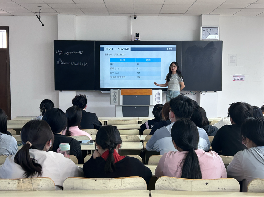 会议伊始,高靖对于成功上岸同学的到来表示热烈的欢迎,并希望台下的同学能够认真聆听汲取经验,为日后的复习道路指引方向。随后,2020级化学工程与工艺王文远、2020级能源化学工程孔凯、2022级应用化学专升本一班李丛丛、2020级化学师范张淑琪、2020级环境科学与工程李玟玟五位考研上岸同学依次上台分享自己在英语方面的学习经验。