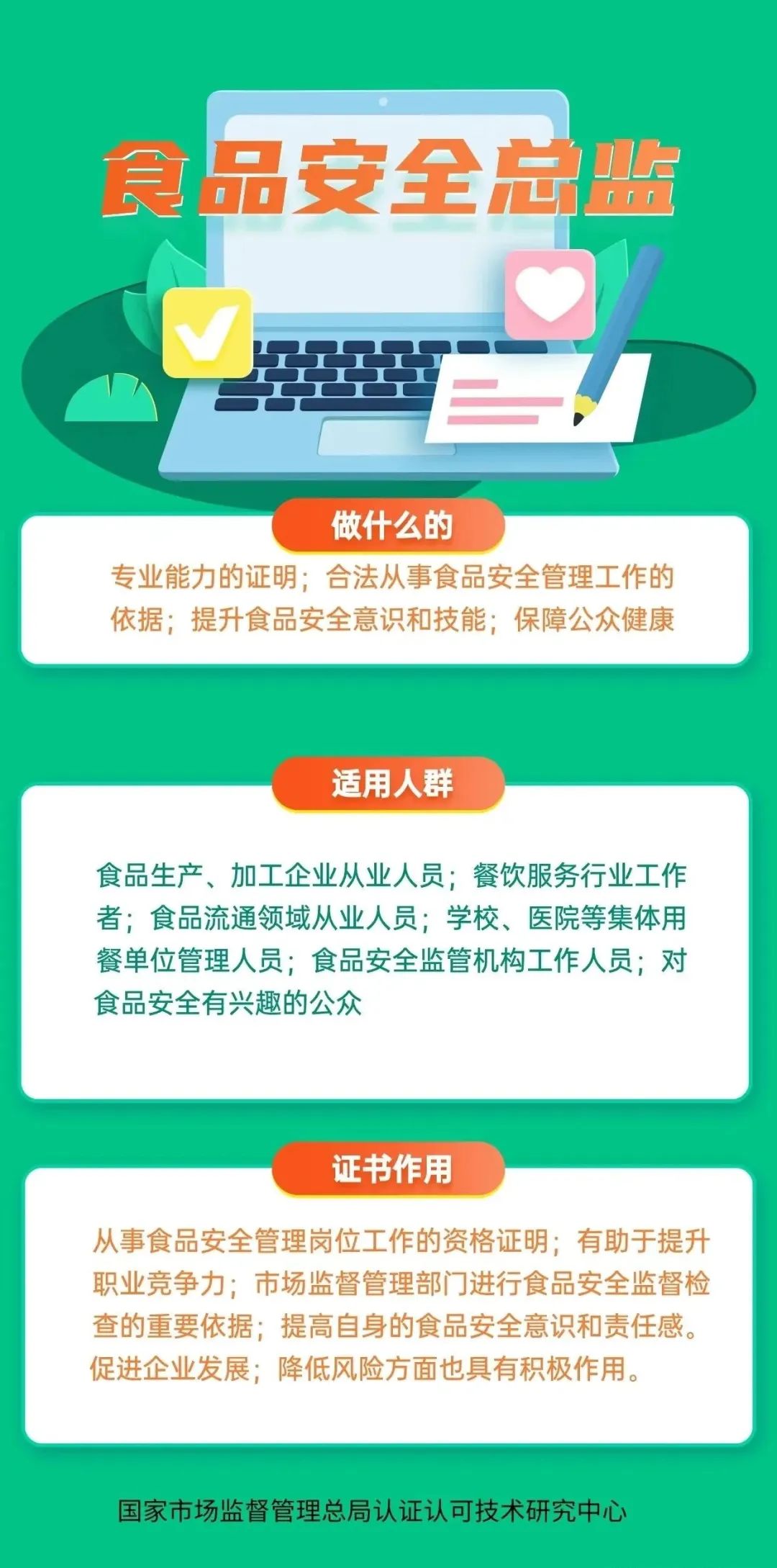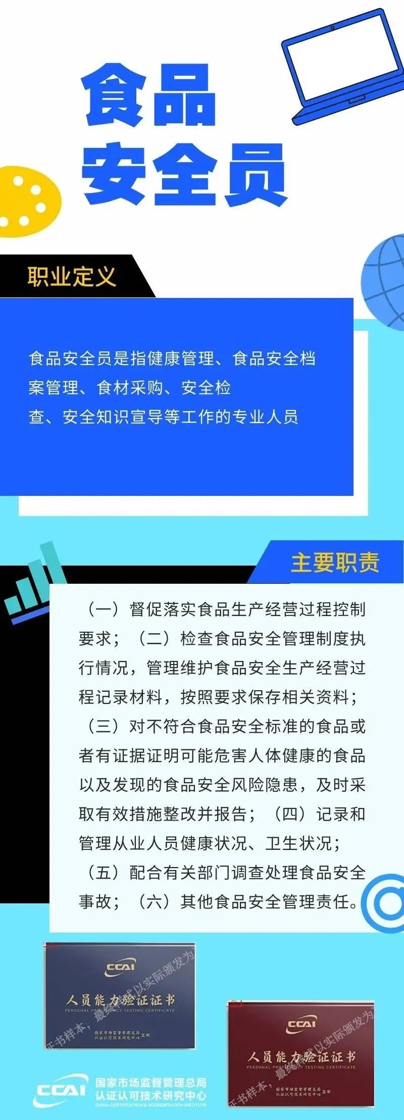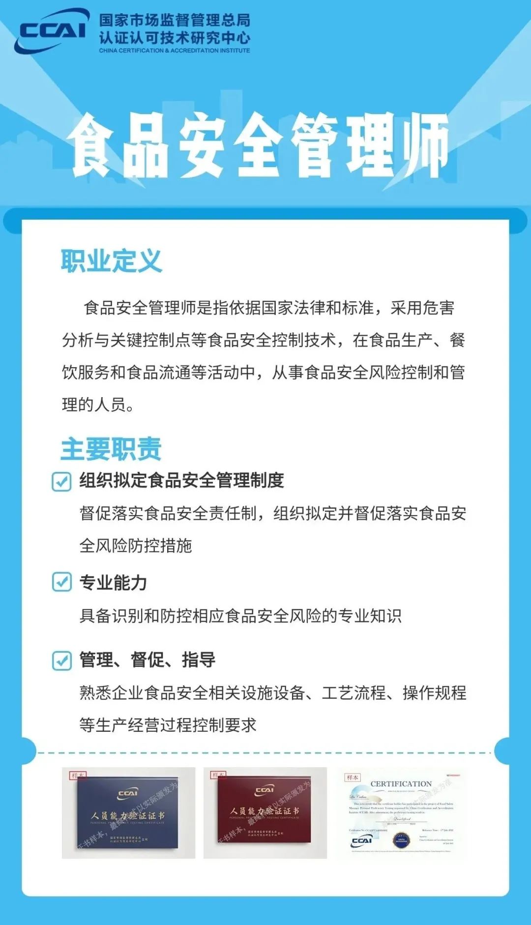2022年10月17日,国家市场监督管理总局认证认可技术研究中心发布《市场监管总局认研中心关于开展人员能力验证工作(食品安全专项)的通知》,面向社会正式开展人员能力验证工作,其中包含了食品安全管理师。