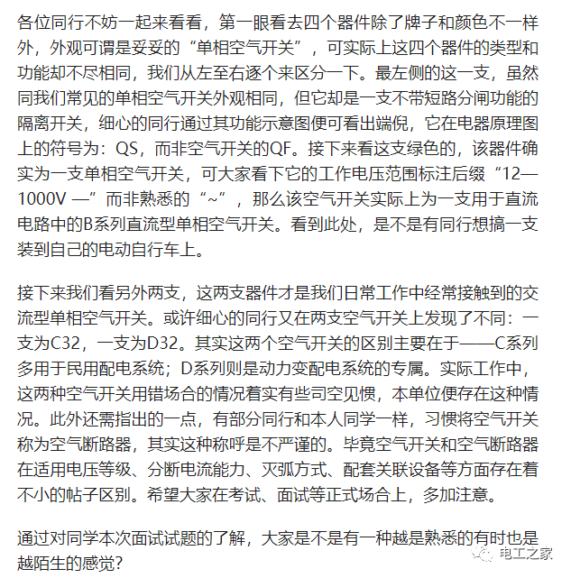 闲言少叙,各位电工同行请看附图,这是是几天前一位同学去某单位参加电工招聘时的试题——这四个器件是不是同一类装置?若不一样请逐个说明一下区别。这试题内容可谓是相当简单,可参与面试者包括同学在内竟无一人答对!甚至有人给出了“这当然不一样了,三个蓝色的一个绿色的能一样吗”的答案,着实让人忍俊不禁。