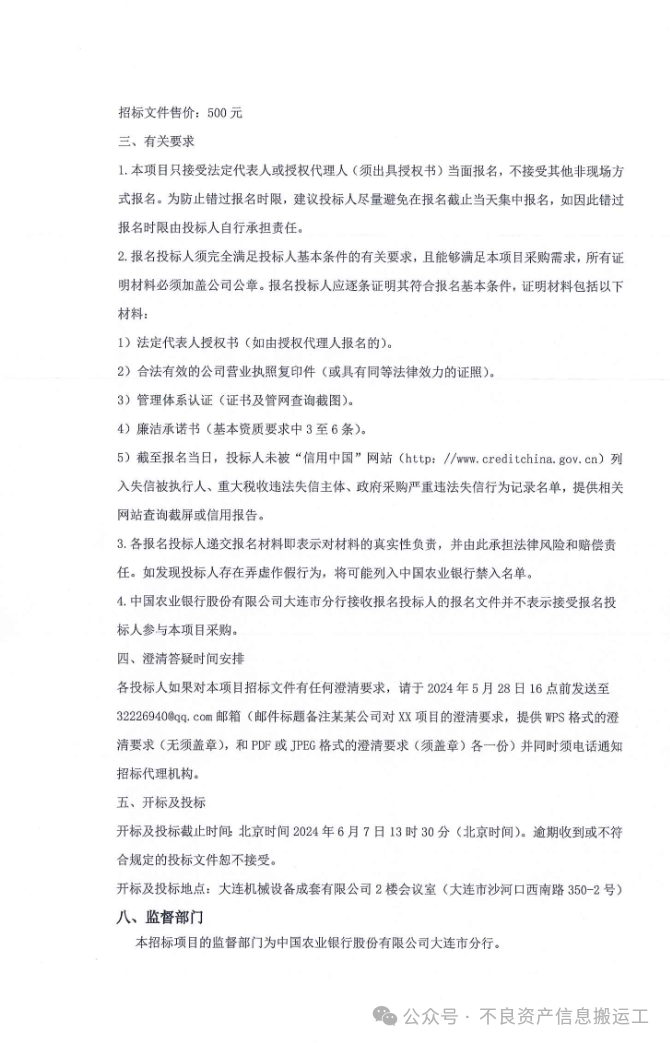 本文所有信息均转载自网络,有兴趣的同业请移步官网(中国招标投标公共服务平台 (cebpubservice.com),金采网 (cfcpn.com))核实报名!!!不良资产信息搬运工不对信息的真实性负责,亦不承担任何法律责任,请有兴趣参与的同业慎重,并去官网报名!