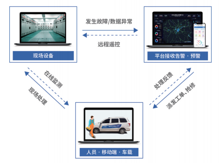 配电运维管理系统可随时随地通过监测现场运行状态数据、报警事件、接线图、用电曲线,可在第一时间向调度中心发送告警指令,调度中心线上派发工单,线下运检人员快速响应,及时处理问题并将检修结果及时上传,实现高效响应、有效监管。