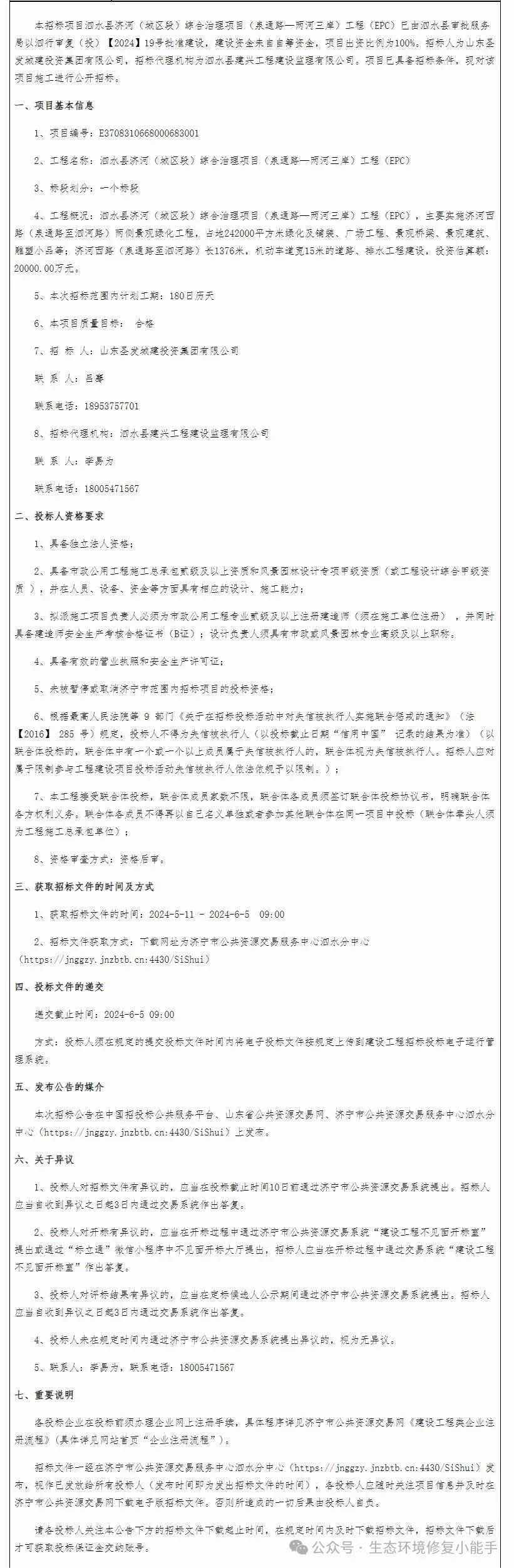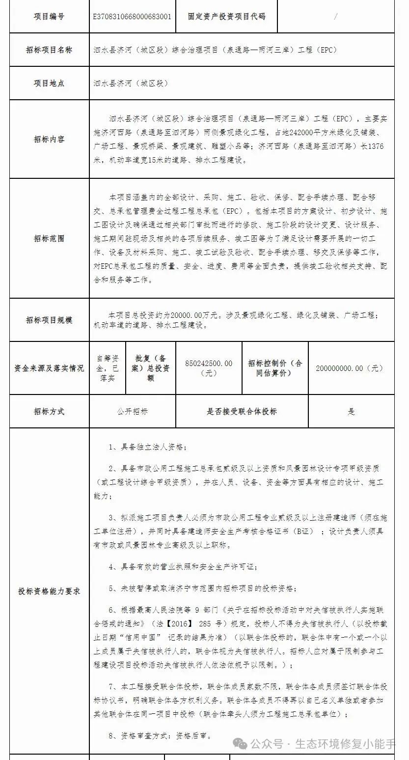 招标分享|2亿!山东泗水县济河(城区段)综合治理项目(泉通路—两河三岸)工程(EPC)
