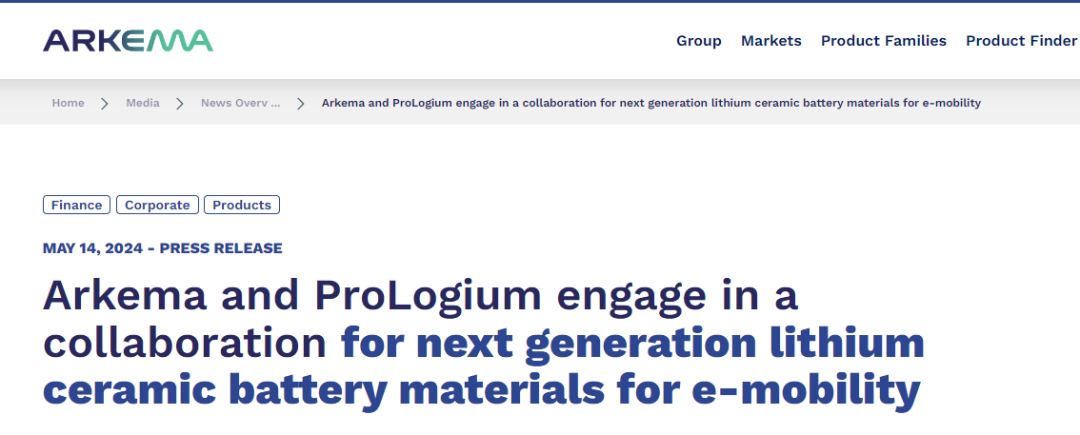 5月14日,全球化工巨头阿科玛(Arkema)宣布和ProLogium(中国台湾电池制造商辉能科技)公司合作开发用于电子交通的下一代锂陶瓷电池材料。