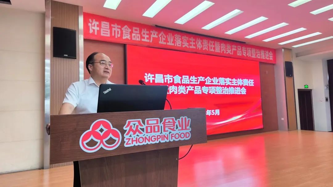 许昌市市场监督管理局食品生产安全监管科周会超科长围绕《聚焦风险防控 健全管理机制》,对全市肉类产品食品生产企业如何落实食品主体责任进行要求。