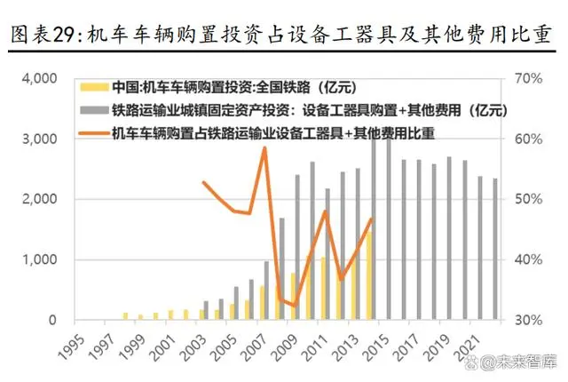 轨交装备是铁路和城市轨道交通运输所需各类装备的总称,主要涵盖了机车车辆、 工程及养路机械、安全保障、通信信号、牵引供电、运营管理等各种机电装备。根据国家铁路局数据, 1999-2014 年(2015 年及以后数据缺失),在设备工器具 购置及其他费用中,机车购置投资额占比在 40%左右,在设备工器具投资中,机 车车辆购置投资额在 80%左右。