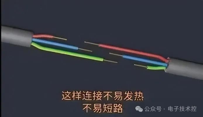 所谓的错位接法就是让每一个接头不要在同一个地方,尽量彼此错开。先把第一根剪掉三分之二,和另外第一根对接包好,再把第二根剪掉三分之一分另处一根对接,接头在两根线对中,最后一根反向也剪掉三分之二,包好,掉好后每个接头相距2公分。这样链接不易发热、不易短路。