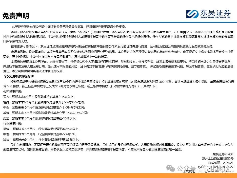本订阅号所载内容不构成对具体证券在具体价位、具体时点、具体市场表现的判断或投资建议,不能够等同于指导具体投资的操作性意见。本订阅号所载内容仅供参考之用,接收人不应单纯依靠本资料的信息而取代自身的独立判断,应自主做出投资决策并自行承担风险。东吴证券研究所及本研究团队不对任何因使用本订阅号所载任何内容所引致或可能引致的损失承担任何责任。