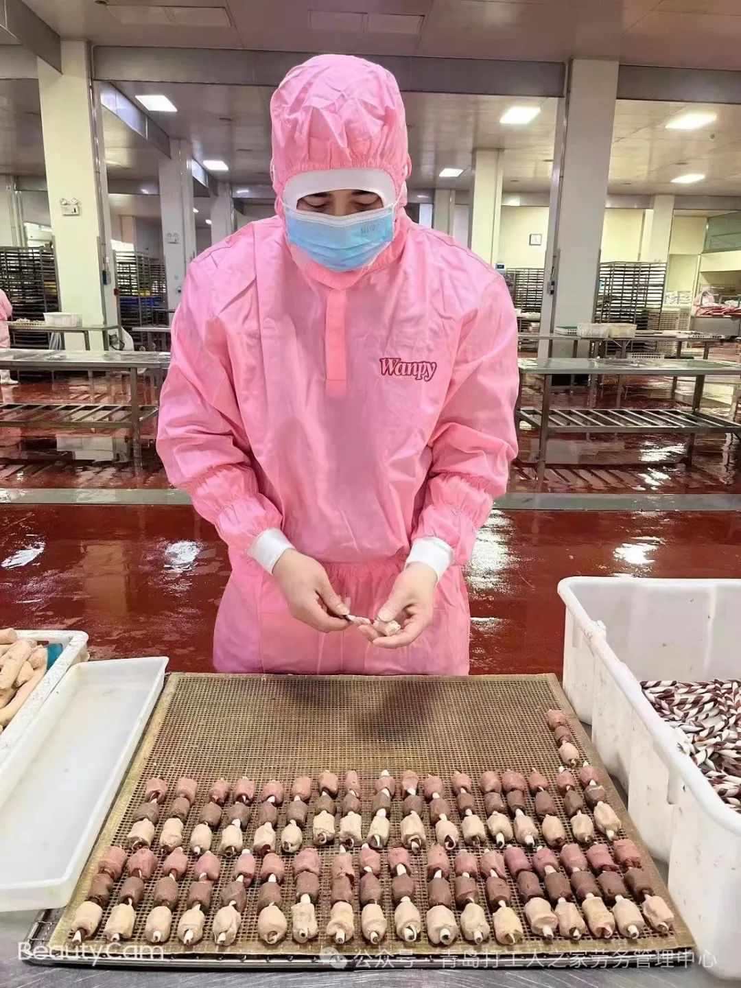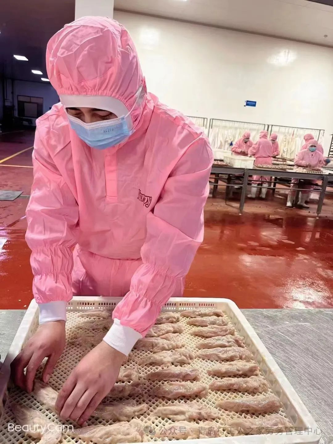 站立工作、需穿无尘服(裤子上衣分开的)、穿水鞋,恒温车间温度在15°左右,因做生肉产品,车间会有生肉味!