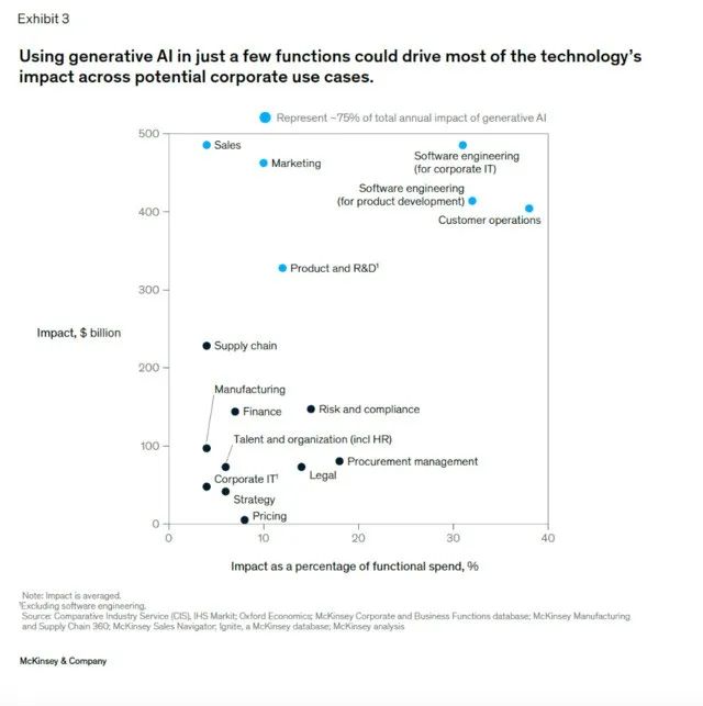 在产品研发方面,AI可以将生产力提高10%至15%。以生命科学和化工为例,人工智能可以更快地产生潜在的分子,加速开发新药物和新材料的过程,这可能会使制药公司和医疗产品公司的利润增加多达25%。