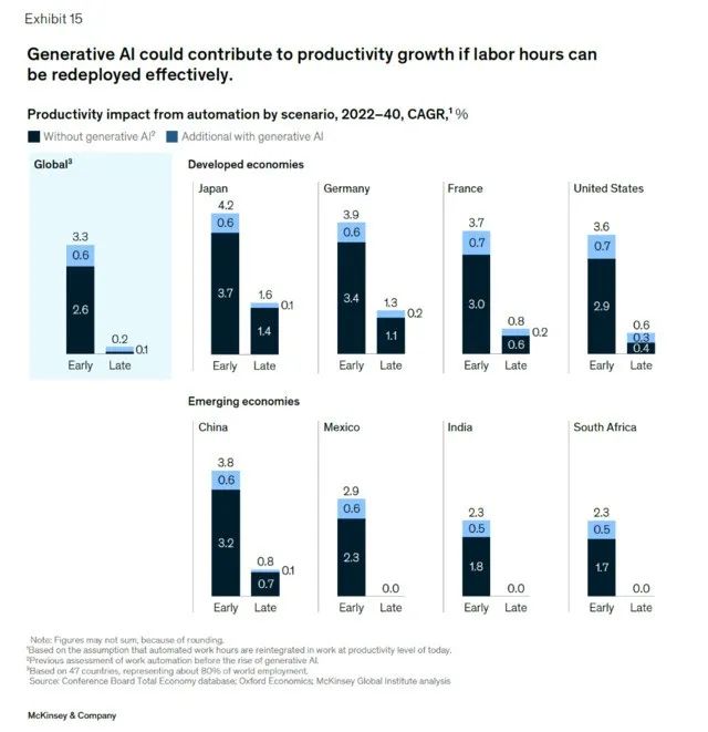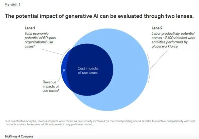 研究主要包括两个方面:1.60多个组织使用生成式AI后的经济增长潜力2.全球约2100项工作活动的劳动生产力潜力。