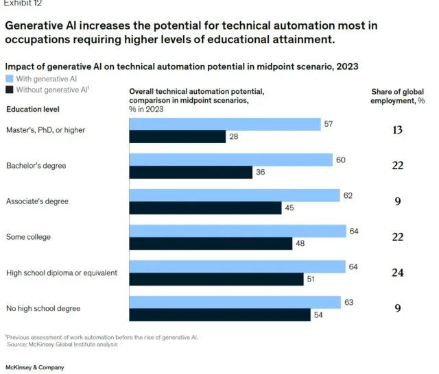 与此同时,麦肯锡指出,此前的众多生产力变革中,拥有高学历的人往往受到的影响较小,但AI的革命将会使高学历的人才受到更大影响:
